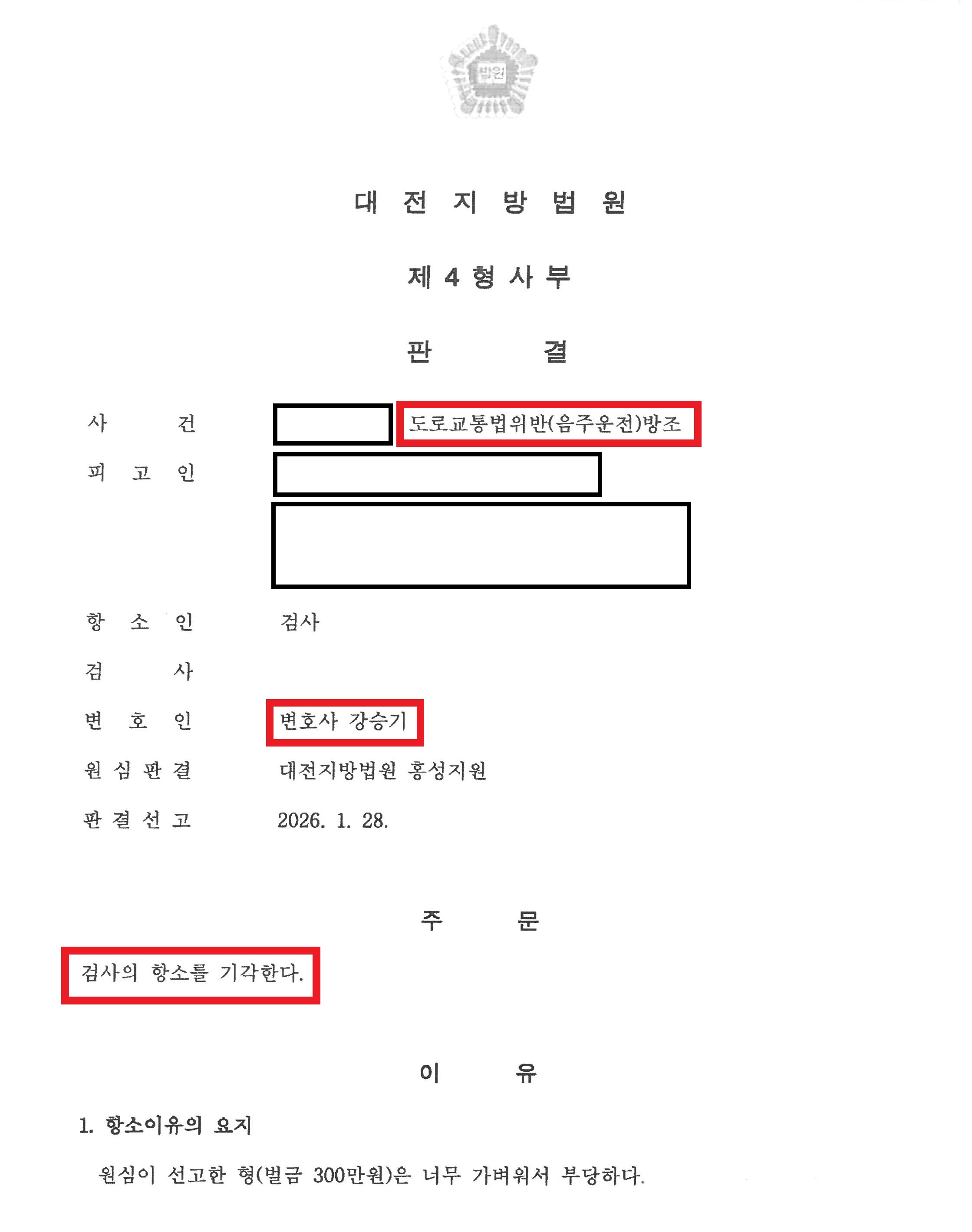 [»ç°Ç°³¿ä ¹× ÇØ°á] ÇǰíÀÎÀº ¼ú¿¡ ÃëÇÑ ÁöÀÎÀÇ À½ÁÖ¿îÀü ÇàÀ§¸¦ Á¦ÁöÇÏÁö ¾Ê°í ½ÂÇÕÂ÷ Á¶¼ö¼®¿¡ µ¿½ÂÇÏ¿© ½Ç³»µîÀ» ²¨ÁÖ´Â µî ±× ¹üÇàÀ» ¿ëÀÌÇÏ°Ô ÇÏ¿© µµ·Î±³Åë¹ýÀ§¹Ý(À½ÁÖ¿îÀü)¹æÁ¶ ÇøÀÇ·Î ±â¼ÒµÇ¾ú½À´Ï´Ù ƯÈ÷ ÇØ´ç À½ÁÖ¿îÀüÀ¸·Î ÀÎÇØ »ó´ë Â÷·® ¿îÀüÀÚ°¡ Áß»óÀ» ÀÔ°í µ¿½ÂÀÚ°¡ »ç¸ÁÇÏ´Â Áß´ëÇÑ »ç°í°¡ ¹ß»ýÇÏ¿´À½¿¡µµ Ç׼ҽɿ¡¼ ÇǰíÀÎÀÇ º¯È£¸¦ ¸ÃÀº °½Â±â º¯È£»ç´Â Á¦1½ÉÀÇ ¾çÇü ÆÇ´ÜÀÌ Àç·®ÀÇ ÇÕ¸®ÀûÀÎ ¹üÀ§ ³»¿¡¼ ÀûÀýÇÏ°Ô °áÁ¤µÇ¾úÀ½À» ¹ý¸®ÀûÀ¸·Î ¼Ò¸íÇÏ¿´½À´Ï´Ù ±× °á°ú Ç×¼Ò½É ÀçÆÇºÎ´Â °½Â±â º¯È£»çÀÇ ÁÖÀåÀ» ¹Þ¾Æµé¿© °Ë»çÀÇ Ç×¼Ò¸¦ ±â°¢ÇÏ´Â ÆÇ°áÀ» ³»·È½À´Ï´Ù